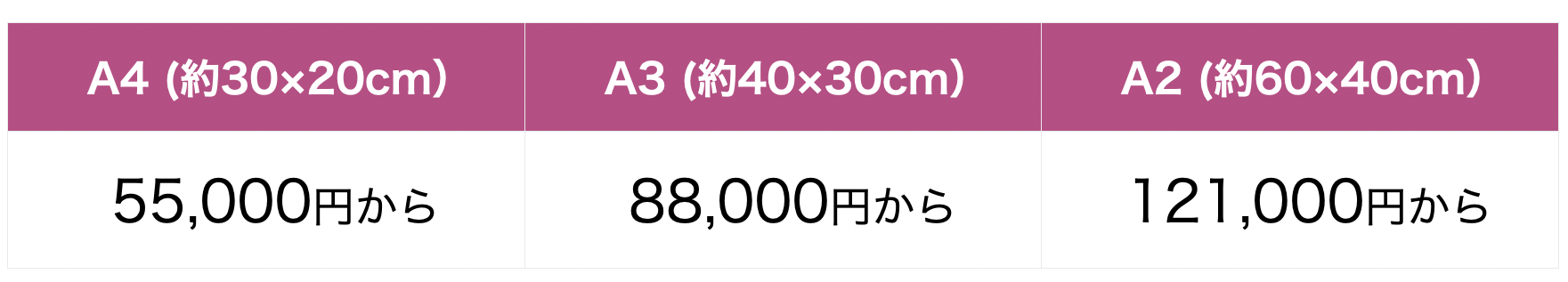 消費税及び額装代・送料込みの金額です。ただし、サイズや内容、額縁の予算等に応じて、金額が変わります。